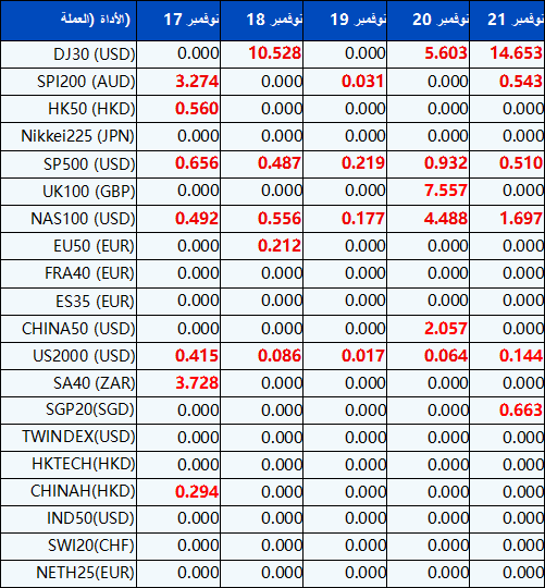 يرجى العلم أنه سيتم تعديل الأرباح المستحقة للمؤشرات التالية لـ CFDs بناءً على التواريخ القادمة للأرباح المستحقة. سيكون التعليق على تداول المؤشرات CFDs في النموذج التالي “Div&<Product Name>&<Net Volume>” الذي يظهر في الرصيد بعد نهاية اليوم الذي يسبق تاريخ دفع الأرباح.