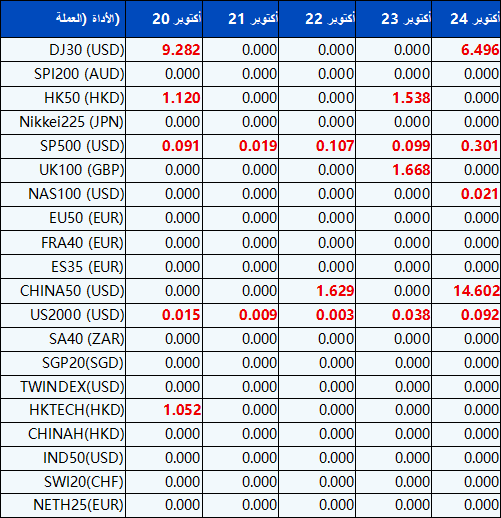 يرجى العلم أنه سيتم تعديل الأرباح المستحقة للمؤشرات التالية لـ CFDs بناءً على التواريخ القادمة للأرباح المستحقة. سيكون التعليق على تداول المؤشرات CFDs في النموذج التالي “Div&<Product Name>&<Net Volume>” الذي يظهر في الرصيد بعد نهاية اليوم الذي يسبق تاريخ دفع الأرباح.