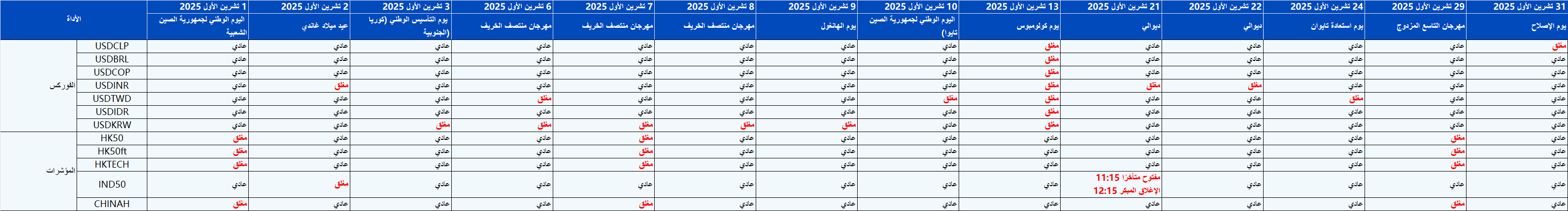يرجى العلم أن ساعات التداول وأوقات جلسة السوق للأدوات التالية سوف تتأثر بالعطلات الرسمية القادمة في شهر أكتوبر.