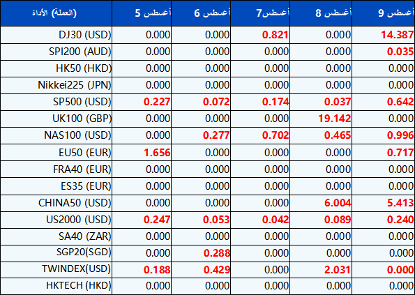 يرجى العلم أنه سيتم تعديل الأرباح المستحقة للمؤشرات التالية لـ CFDs بناءً على التواريخ القادمة للأرباح المستحقة. سيكون التعليق على تداول المؤشرات CFDs في النموذج التالي “Div&<Product Name>&<Net Volume>” الذي يظهر في الرصيد بعد نهاية اليوم الذي يسبق تاريخ دفع الأرباح.