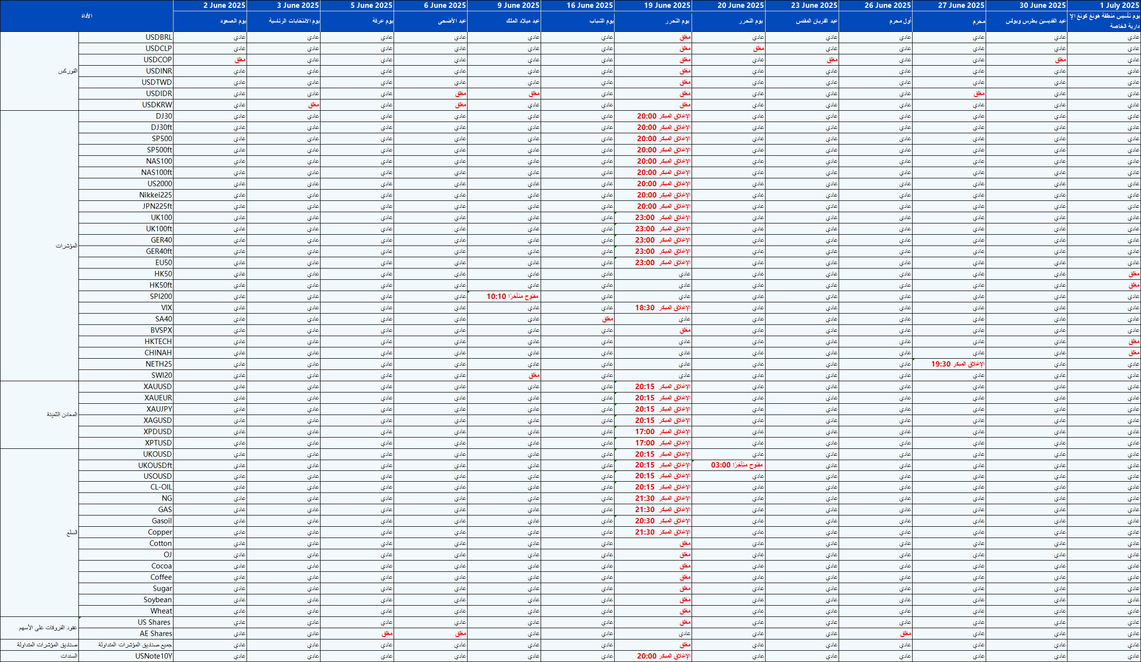 يرجى العلم أن ساعات التداول وأوقات جلسة السوق للأدوات التالية سوف تتأثر بالعطلات الرسمية القادمة في شهر يونيو