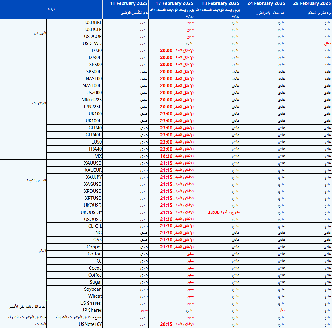 يرجى العلم بأن ساعات التداول وأوقات جلسة السوق للأدوات التالية سوف تتأثر بالعطلات الرسمية القادمة في شهر فبراير. يُرجى الرجوع إلى الجدول أدناه الذي يوضح: