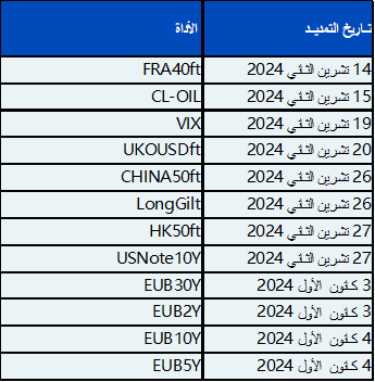 يرجى العلم أنه سيتم تجاوز الأدوات التالية للعقود مقابل الفروقات تلقائيًا وفقًا للتواريخ الموجودة في الجدول أدناه. حيث يمكن أن يكون هناك فرق في التسعير بين العقود القديمة والجديدة، نوصي العملاء بمراقبة مراكزهم عن كثب وإدارة المراكز وفقًا لذلك.