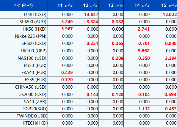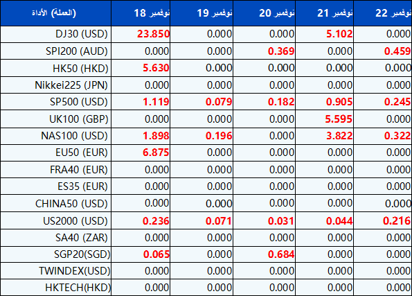 يرجى العلم أنه سيتم تعديل الأرباح المستحقة للمؤشرات التالية لـ CFDs بناءً على التواريخ القادمة للأرباح المستحقة. سيكون التعليق على تداول المؤشرات CFDs في النموذج التالي “Div&<Product Name>&<Net Volume>” الذي يظهر في الرصيد بعد نهاية اليوم الذي يسبق تاريخ دفع الأرباح.