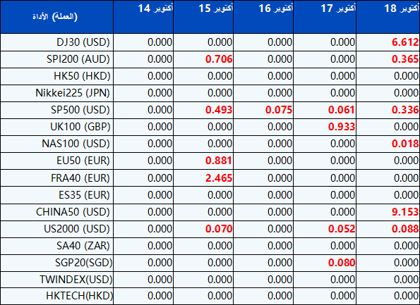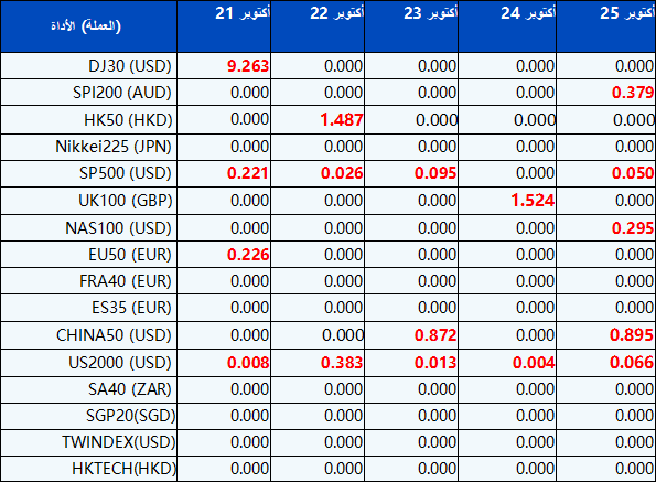 يرجى العلم أنه سيتم تعديل الأرباح المستحقة للمؤشرات التالية لـ CFDs بناءً على التواريخ القادمة للأرباح المستحقة. سيكون التعليق على تداول المؤشرات CFDs في النموذج التالي “Div&<Product Name>&<Net Volume>” الذي يظهر في الرصيد بعد نهاية اليوم الذي يسبق تاريخ دفع الأرباح.