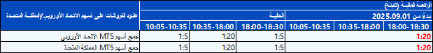 يرجى ملاحظة أن البيانات أعلاه قابلة للتغيير من وقت لآخر. لمزيد من التفاصيل، يرجى الرجوع إلى MT4/MT5.