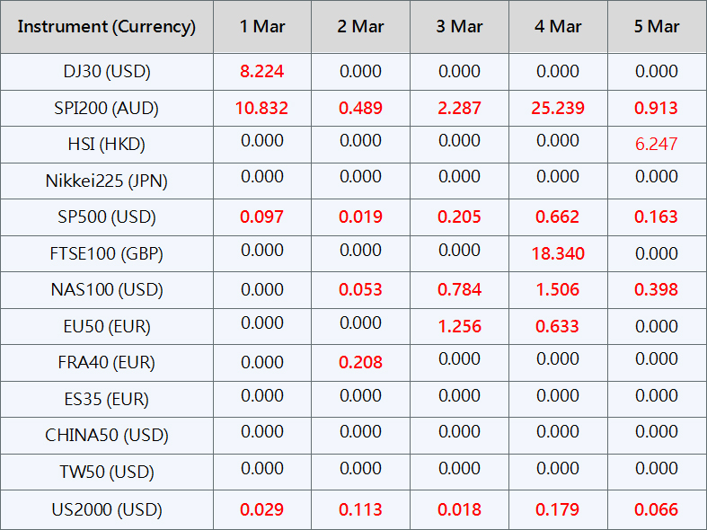 Please note that the above data are subject to changes. Please refer to MT4/MT5 for details.