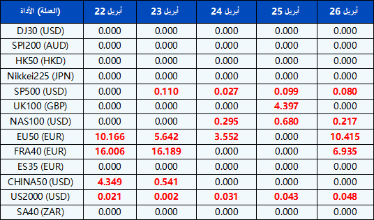 يرجى العلم أنه سيتم تعديل الأرباح المستحقة للمؤشرات التالية لـ CFDs بناءً على التواريخ القادمة للأرباح المستحقة. سيكون التعليق على تداول المؤشرات CFDs في النموذج التالي “Div&<Product Name>&<Net Volume>” الذي يظهر في الرصيد بعد نهاية اليوم الذي يسبق تاريخ دفع الأرباح.