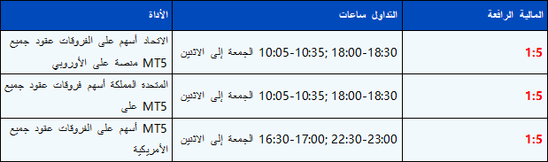 خلال ساعات التداول المحددة هذه، تكون الرافعة المالية لمنتجات عقود الفروقات على أسهم MT5 ثابتة عند 1:5، ويلزم وجود هامش إضافي لفتح أي صفقات جديدة. وبمجرد انتهاء الاحتفاظ بالمراكز خلال ساعات التداول المحددة، ستعود الرافعة المالية تلقائيًا إلى 1:20.