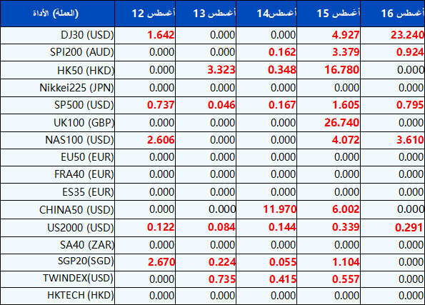 يرجى العلم أنه سيتم تعديل الأرباح المستحقة للمؤشرات التالية لـ CFDs بناءً على التواريخ القادمة للأرباح المستحقة. سيكون التعليق على تداول المؤشرات CFDs في النموذج التالي “Div&<Product Name>&<Net Volume>” الذي يظهر في الرصيد بعد نهاية اليوم الذي يسبق تاريخ دفع الأرباح.