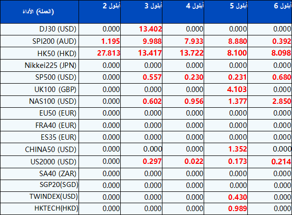 يرجى العلم أنه سيتم تعديل الأرباح المستحقة للمؤشرات التالية لـ CFDs بناءً على التواريخ القادمة للأرباح المستحقة. سيكون التعليق على تداول المؤشرات CFDs في النموذج التالي “Div&<Product Name>&<Net Volume>” الذي يظهر في الرصيد بعد نهاية اليوم الذي يسبق تاريخ دفع الأرباح.