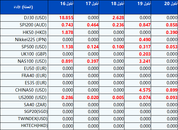 يرجى العلم أنه سيتم تعديل الأرباح المستحقة للمؤشرات التالية لـ CFDs بناءً على التواريخ القادمة للأرباح المستحقة. سيكون التعليق على تداول المؤشرات CFDs في النموذج التالي “Div&<Product Name>&<Net Volume>” الذي يظهر في الرصيد بعد نهاية اليوم الذي يسبق تاريخ دفع الأرباح.