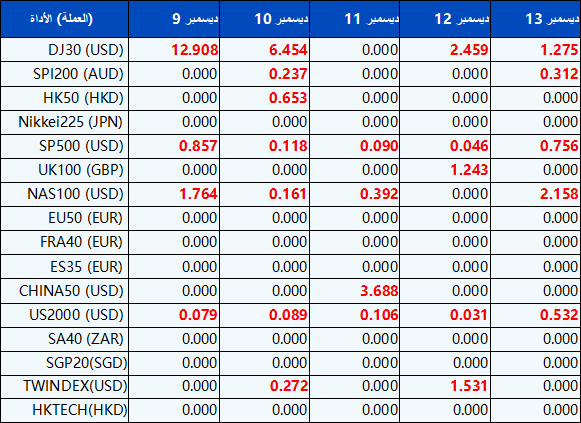 يرجى العلم أنه سيتم تعديل الأرباح المستحقة للمؤشرات التالية لـ CFDs بناءً على التواريخ القادمة للأرباح المستحقة. سيكون التعليق على تداول المؤشرات CFDs في النموذج التالي “Div&<Product Name>&<Net Volume>” الذي يظهر في الرصيد بعد نهاية اليوم الذي يسبق تاريخ دفع الأرباح.