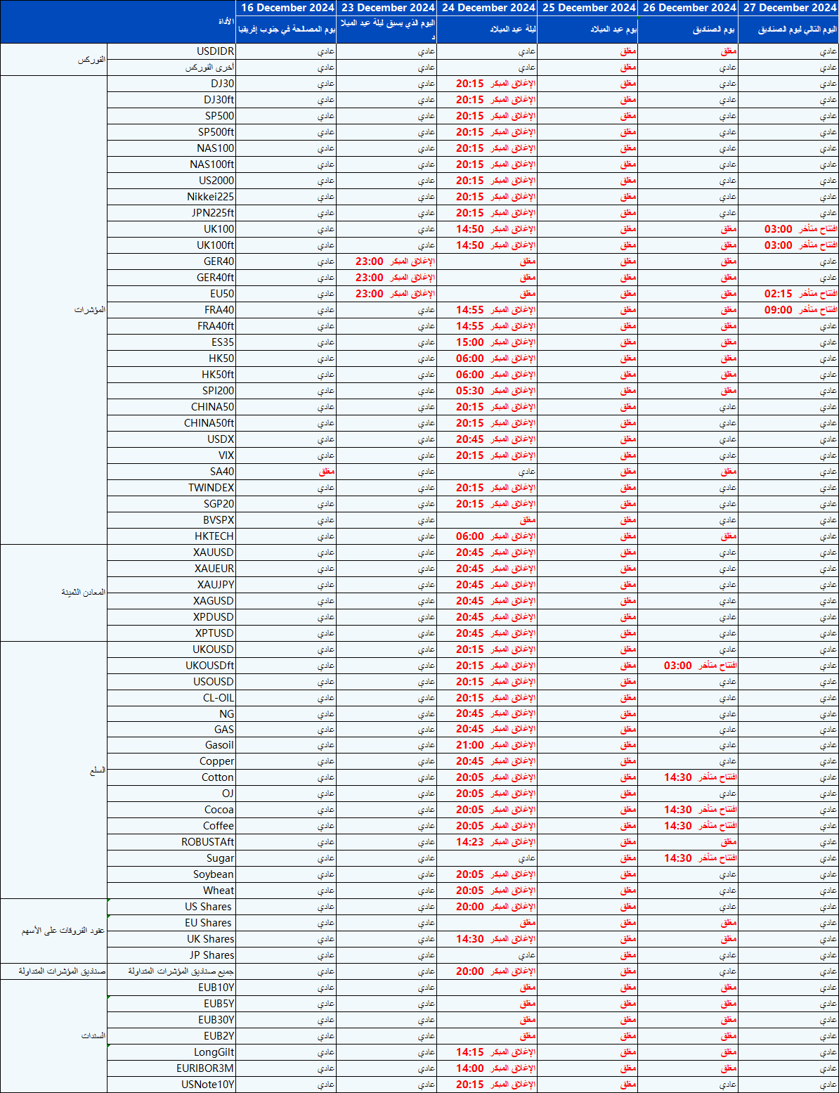 يرجى العلم أن ساعات التداول وأوقات جلسات السوق للأدوات التالية ستتأثر بالعطلات القادمة شهر كانون الأول.