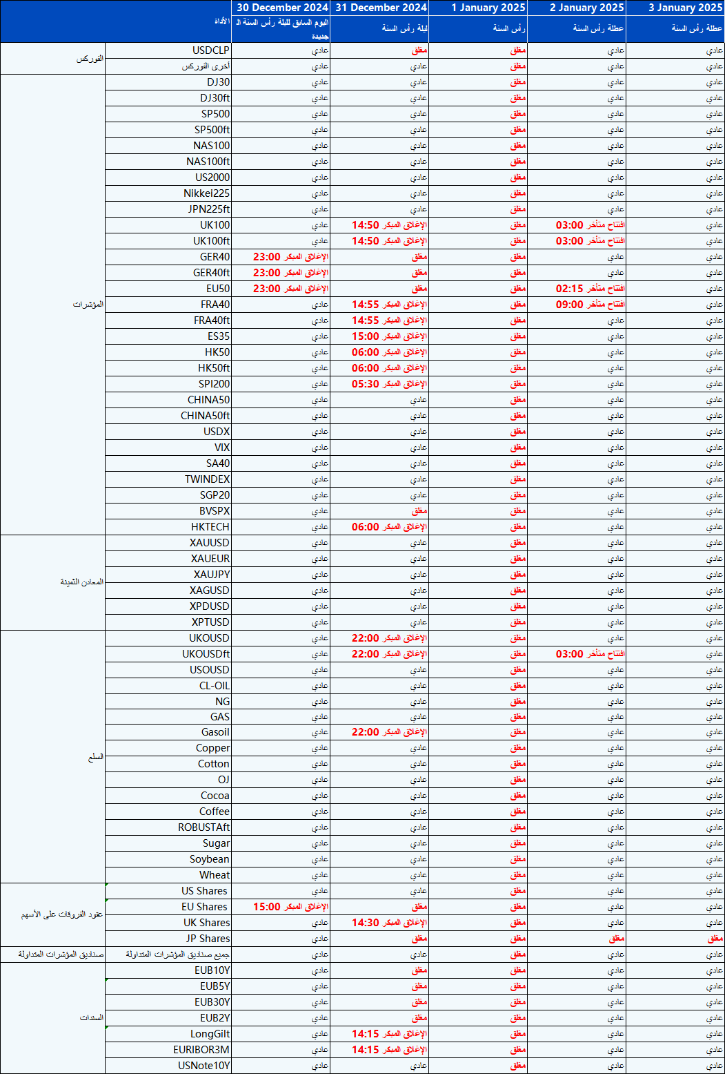 يرجى العلم بأن ساعات تداول الأدوات المالية التالية وأوقات جلسات السوق سوف تتأثربعطلة رأس السنة القادمة