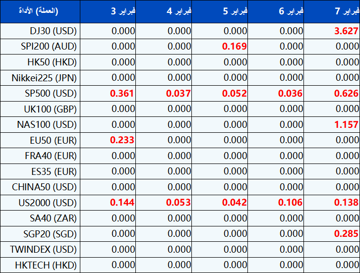 يرجى العلم أنه سيتم تعديل الأرباح المستحقة للمؤشرات التالية لـ CFDs بناءً على التواريخ القادمة للأرباح المستحقة. سيكون التعليق على تداول المؤشرات CFDs في النموذج التالي “Div&<Product Name>&<Net Volume>” الذي يظهر في الرصيد بعد نهاية اليوم الذي يسبق تاريخ دفع الأرباح.