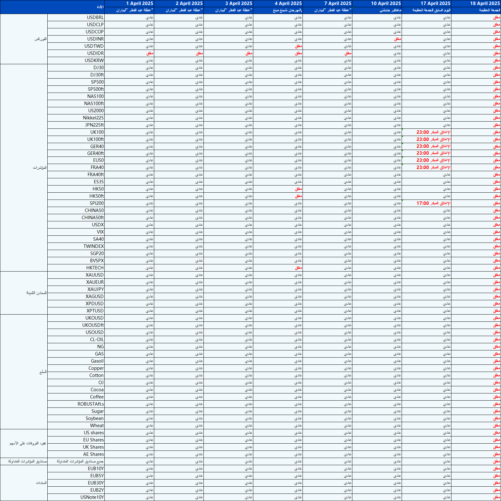 يرجى ملاحظة أن ساعات التداول وأوقات جلسة السوق للأدوات التالية سوف تتأثر بالعطلات الرسمية القادمة في أبريل وعطلة عيد العمال.يُرجى الرجوع