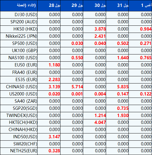 يرجى العلم أنه سيتم تعديل الأرباح المستحقة للمؤشرات التالية لـ CFDs بناءً على التواريخ القادمة للأرباح المستحقة. سيكون التعليق على تداول المؤشرات CFDs في النموذج التالي “Div&<Product Name>&<Net Volume>” الذي يظهر في الرصيد بعد نهاية اليوم الذي يسبق تاريخ دفع الأرباح.