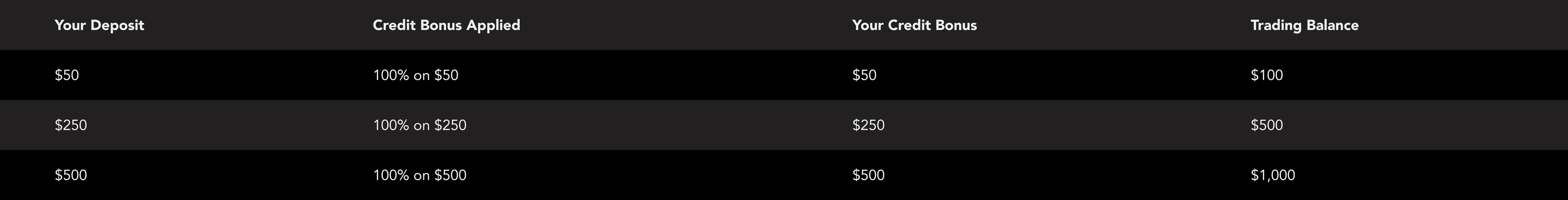 5.Eligible Clients who meet the criteria set forth herein are able to receive credit bonuses or otherwise known as trading credit, equal to: